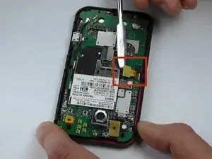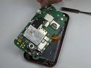 После удаления материнской платы используйте либо металлические пинцеты, либо металлическую лопатку, чтобы удалить динамик, поддев его, как показано.