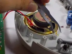 Динамик приклеен к передней крышке. Чтобы удалить клей, используйте металлическую лопатку или фен, чтобы нагреть клей и снять динамик.