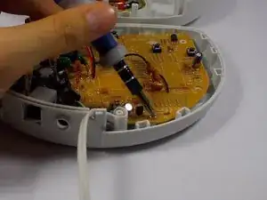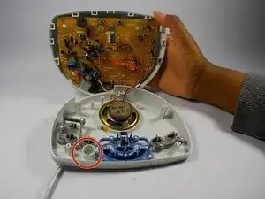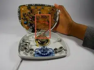 Микрофон останется на передней крышке, будучи подключённым к основной плате на задней крышке. Осторожно, используя палец, вытащите микрофон из крышки.
