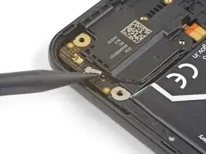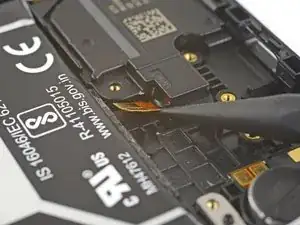 Воспользуйтесь кончиком лопатки, чтобы поддеть и отключить гибкий кабель экрана.