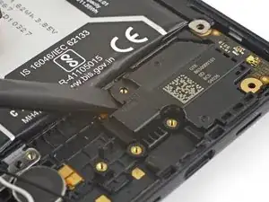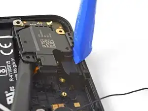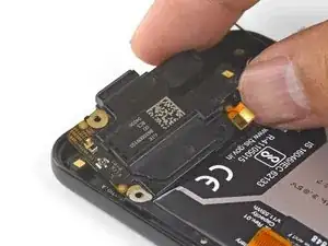 Заведите конец лопатки под контактную площадку гибкого кабеля динамика и отсоедините её от рамки телефона.