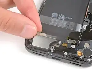При повторной установке динамика убедитесь, что графитовая плёнка не мешает. Затем вставьте динамик под углом вниз и сдвиньте его к передней части телефона, чтобы прокладка встала в вырез рамки.