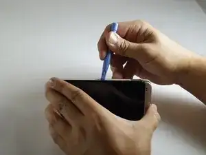 Аккуратно снимите кнопку регулировки громкости. Используя пластиковый инструмент для вскрытия или медиатор, ослабьте заднюю панель телефона. Обходите телефон по периметру, следуя по шву задней панели.