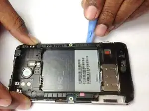 Пользуясь пластиковой открывалкой, приподнимите аккумулятор снизу, возле подставки.