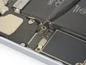 Используйте острый наконечник лопатки, чтобы приподнять и отключить антеннный кабель от его разъёма возле верхней части платы логики.