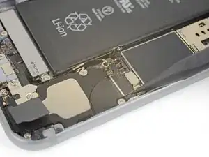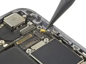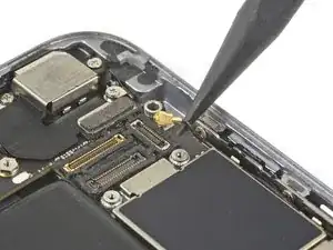 Используйте острый наконечник лопатки, чтобы приподнять и отключить шлейф разъёма Lightning от его разъёма на плате логики.