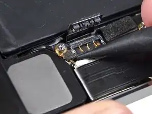 Удалите два винта Phillips #000 длиной 1,6 мм, крепящие металлическую скобу разъема аккумулятора к плате.
