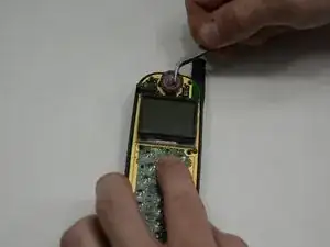 Используя лопатку или пинцет, аккуратно подденьте между динамиком и основной платой.