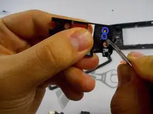 С помощью инструмента для поддевания осторожно надавите на одну из золотистых пружин, выходящих из него. Приложите достаточно давления, чтобы модуль динамика был оторван от его клеевого основания.