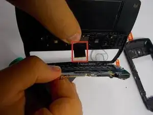 Установив два основных пальца на задней панели, где была батарея, используйте ногтевой палец (или инструмент для поддевания) и поместите его на край этого тонкого корпуса. Упертесь ногтём (или инструментом) по всему корпусу слева направо. Отключите корпус от секции клавиатуры. Переверните телефон и снимите его.