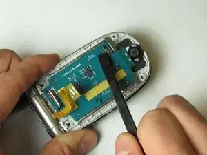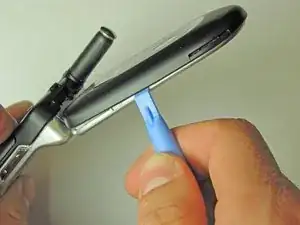 Используйте пластиковый инструмент для вскрытия, чтобы сделать зазор между верхней крышкой и лицевой стороной телефона.
