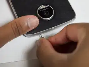 Удалите SIM-карту: прочно вставьте инструмент для извлечения SIM 0,8 мм в отверстие для извлечения SIM на верхнем левом торце телефона, пока лоток SIM не выйдет из корпуса.