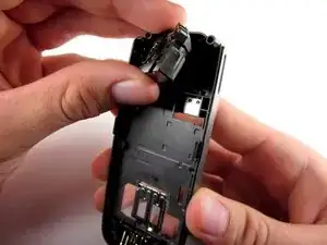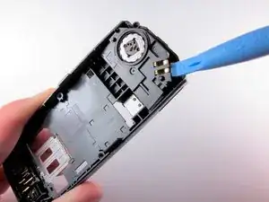 С помощью пластикового инструмента для вскрытия аккуратно подденьте динамик и выньте его из гнезда в задней крышке телефона.