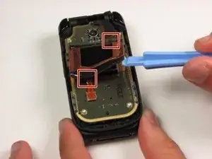 Используя пластиковый медиатор, отведите шлейф от платы.