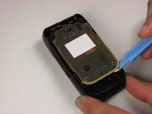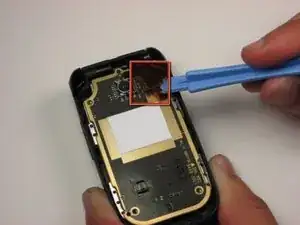 Используя инструмент для вскрытия корпуса, аккуратно подденьте динамик в нижнем углу, сдвигая его справа налево, пока он не выйдет из посадочного места.