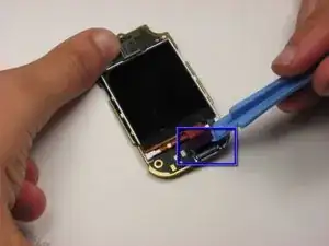 Используя пластиковый медиатор, приподнимите соединение ленточного шлейфа под передним ЖК‑экраном.