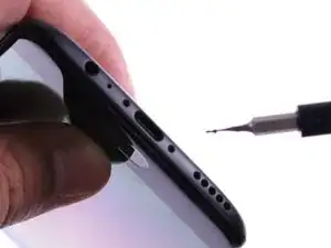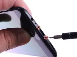 Отверните два винта Torx #2 длиной 1 мм в нижней части телефона, поворачивая отвертку против часовой стрелки.