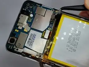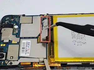 С помощью изогнутых пинцетов отсоедините чёрный ленточный кабель. Это делается для отключения батареи.