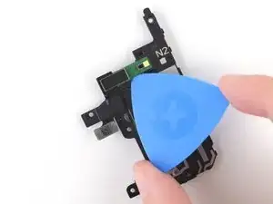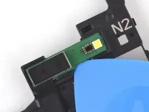 При повторной сборке следуйте этому руководству, если вы используете заранее вырезанную клейкую прокладку для закрепления нового лазерного датчика автофокусировки на динамике разговорного телефона.