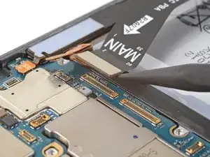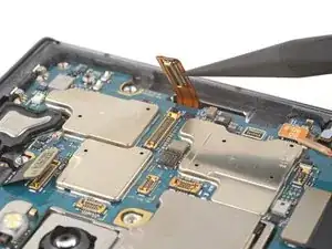 Используйте заострённый конец лопатки, чтобы поддеть и отсоединить защёлкивающийся разъём антенны NFC от платы.