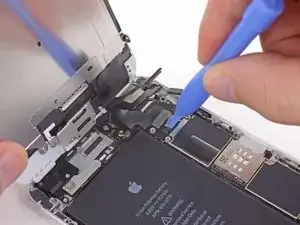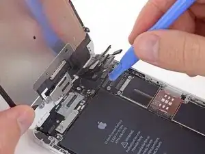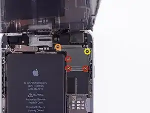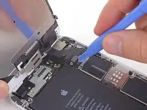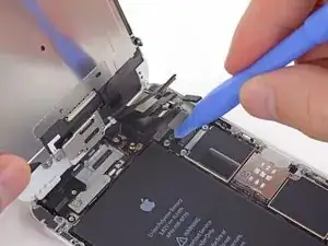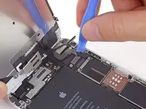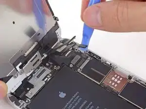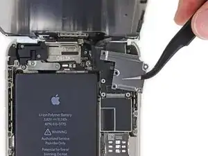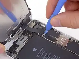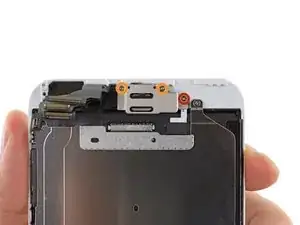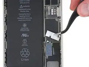 Удалите металлическую крепежную пластину разъема батареи из iPhone.