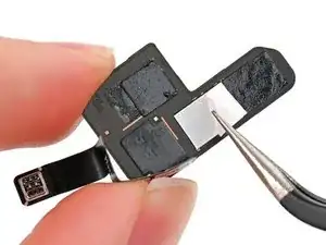 С помощью пинцета захватите тяговую петлю клейкой ленты растяжения, расположенную на краю антенны 5G mmWave.