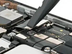Используйте острый конец лопатки, чтобы приподнять и отключить нажимные разъемы динамика разговорного и антенны 5G mmWave, расположенные в правом верхнем углу платы.