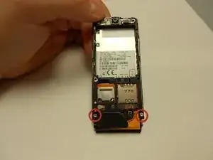 Используя отвертку T5, ослабьте и снимите два винта под наклейкой Sony Ericsson, поворачивая их против часовой стрелки.