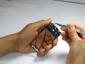 С помощью пинцета выньте модуль динамика, крепко держась с одной стороны, затем медленно и осторожно потяните модуль вверх.