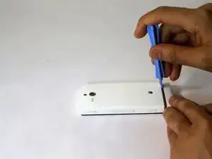 Вставьте пластиковый инструмент для открытия между корпусом телефона и тонкой пластиковой задней крышкой.