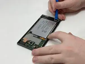 После снятия задней крышки используйте инструмент iFixit, чтобы отсоединить гибкий кабель.