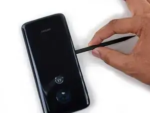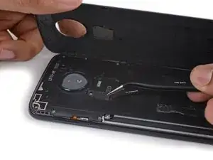 Не вставляйте лопатку слишком глубоко и подденьте медленно, чтобы не повредить шлейф датчика отпечатка пальца и не треснуло заднее стекло.