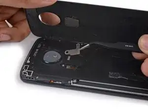 Вам потребуется освободить эти клеевые полосы, не повредив шлейф датчика отпечатка пальца, расположенный в центре телефона.
