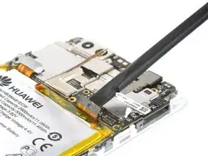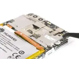 Металлическая пластина, закрывающая разъем аккумулятора, имеет по два маленьких крючка с каждой стороны. Используйте пинцет, чтобы освободить их и отогнуть пластину вверх.