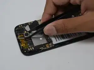 Отсоедините золотой компонент, прикреплённый к камере, потянув вверх с помощью пинцета.