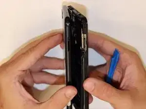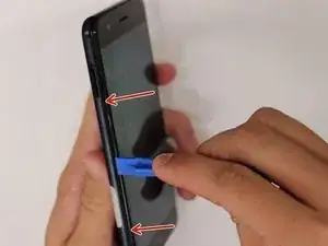 Вставьте инструмент для поддевания между экраном и металлической задней панелью телефона внизу, чтобы снять заднюю панель.