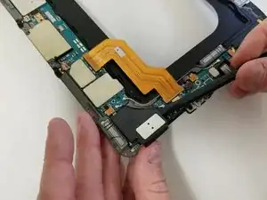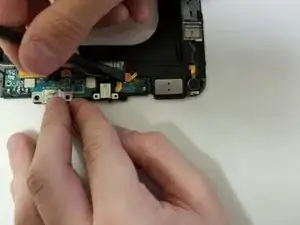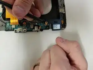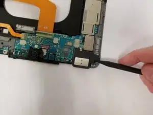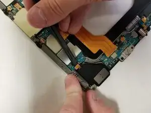 Используйте плоский конец лопатки, чтобы отключить ленточный разъём от материнской платы и удалить динамик из устройства.