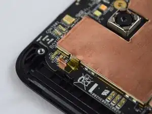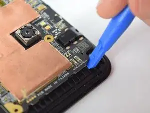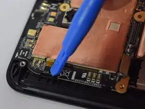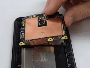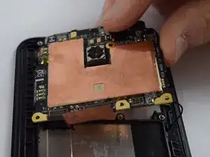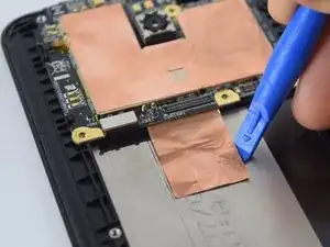 С помощью пластикового инструмента приподнимите медную теплоотводящую пластину от корпуса телефона, вставив инструмент в один из верхних углов пластины и медленно проведя им по краям.