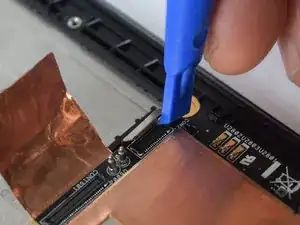 С помощью пластикового инструмента отсоедините кабель дисплея от боковой части материнской платы, аккуратно подставив инструмент под кабель дисплея и мягко потянув наружу.