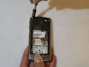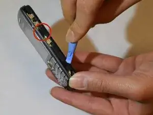 После удаления двух винтов в верхней части возьмите лопаточку и найдите два зазора слева и справа от кнопки, выпускающей крышку батарейного отсека.