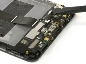 Используйте лопатку, чтобы отключить шлейф динамика и шлейф порта зарядки от дочерней платы.