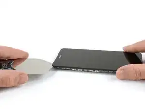После ослабления клея в верхней части телефона используйте iFlex или медиатор для вскрытия и аккуратно вставьте его между средним каркасом и дисплеем.