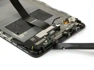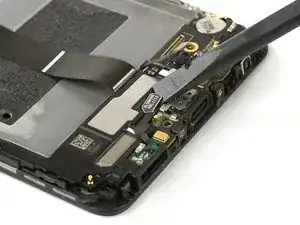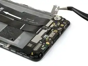 С помощью лопатки извлеките динамик и порт зарядки. Под ними есть клей, и узел может немного прилипать.