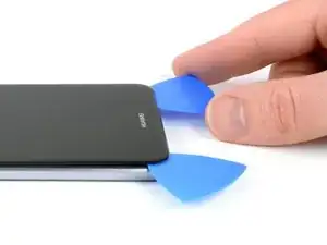 Вставьте кончик плоской лопатки между задней крышкой и рамой и проведите им вокруг телефона, чтобы отрезать клей.