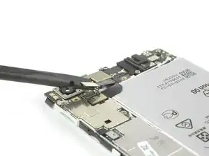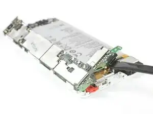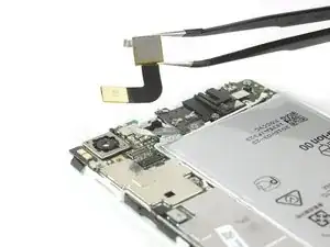 Используйте пинцет, чтобы снять металлическую защёлку, прикрывающую разъёмы шлейфов дисплея и аккумулятора.