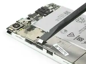 Удалите два винта Phillips #00, удерживающие две металлические защёлки, прикрывающие фронтальную камеру, разъёмы шлейфов дисплея и аккумулятора.