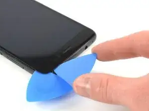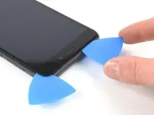 Просуньте кончик медиатора к нижнему правому углу, чтобы перерезать клей.