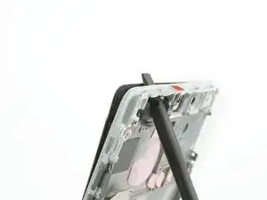 Когда клей размягчится, вставьте лопаточку через отсек камеры в среднюю рамку и оттолкните дисплей от рамки.