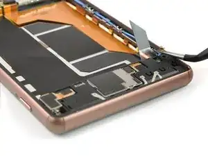 Чтобы полностью снять дисплей с телефона, протяните шлейф дисплея через зазор в средней раме в нижней части телефона.