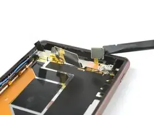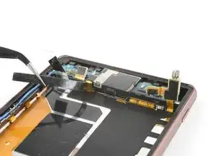 С помощью пинцета вытяните две черные клейкие полоски из телефона, но пока не тяните окончательно.